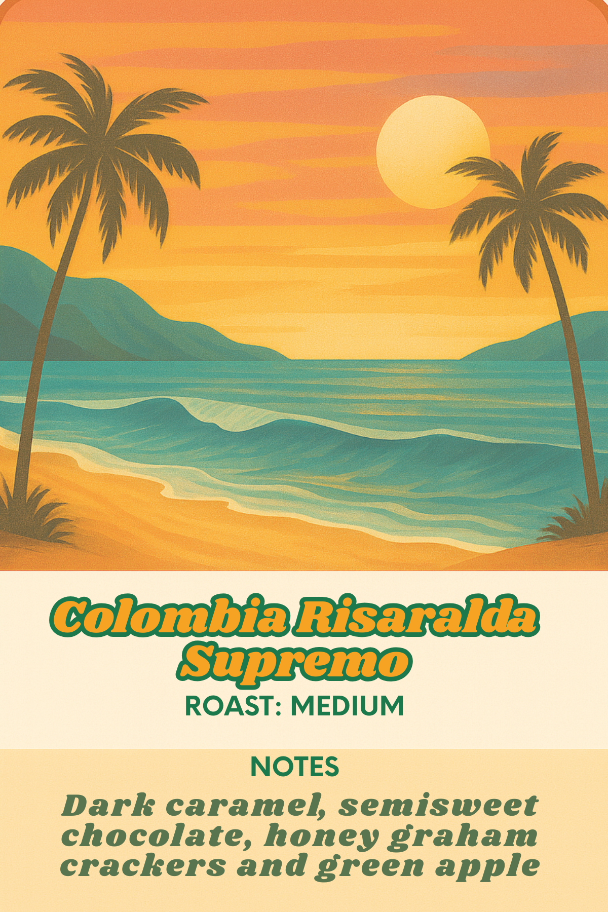 Our newest offering.....Colombia Risaralda Supremo Caramel, semisweet chocolate, honey graham crackers, and green apple.